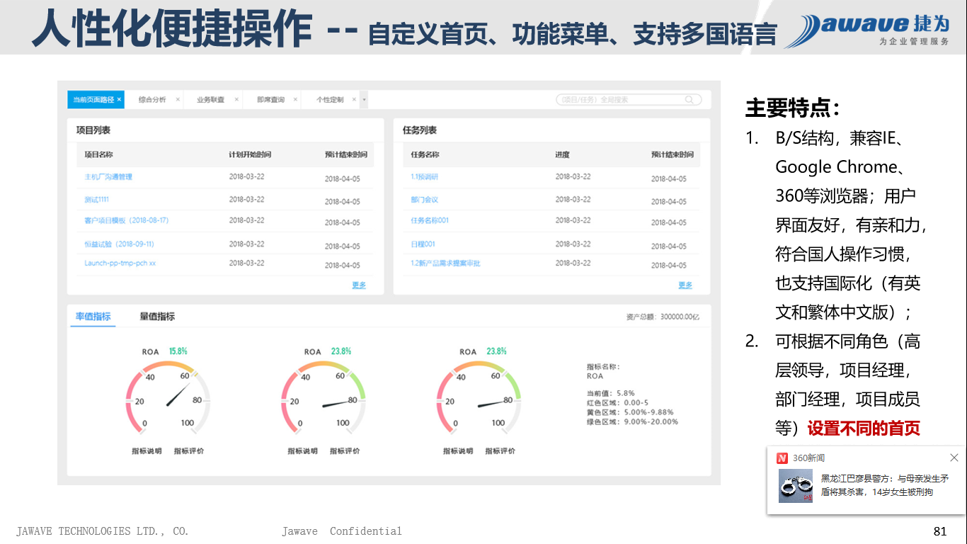 此外,捷为iMIS-PM集成项目管理系统以决策层、管理层和执行层三个层级作为项目管理主线,支持项目角色自定义,多达100多项细化权限。